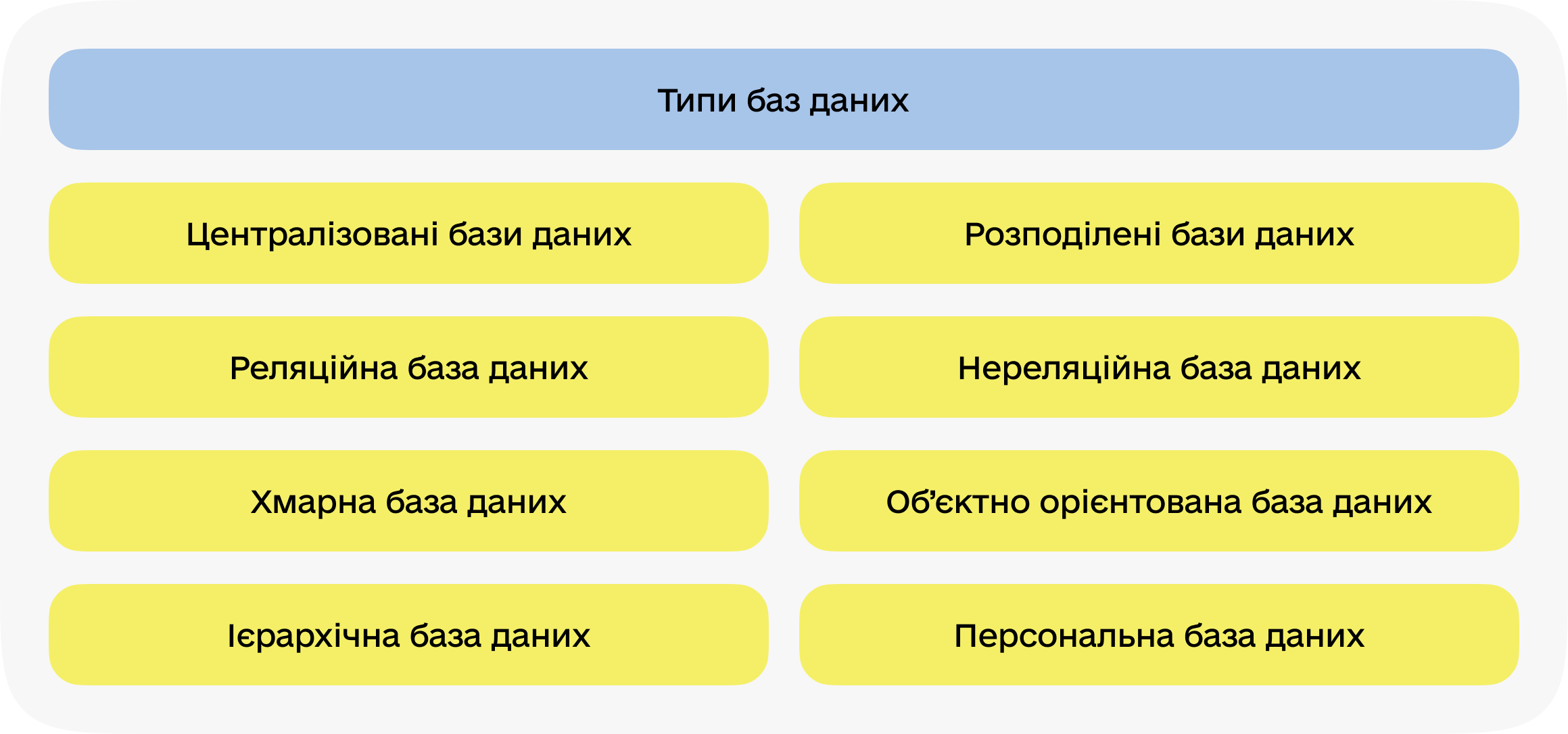 Існує декілька моделей (чи типів) баз даних, основні: ієрархічна, мережна та реляційна.