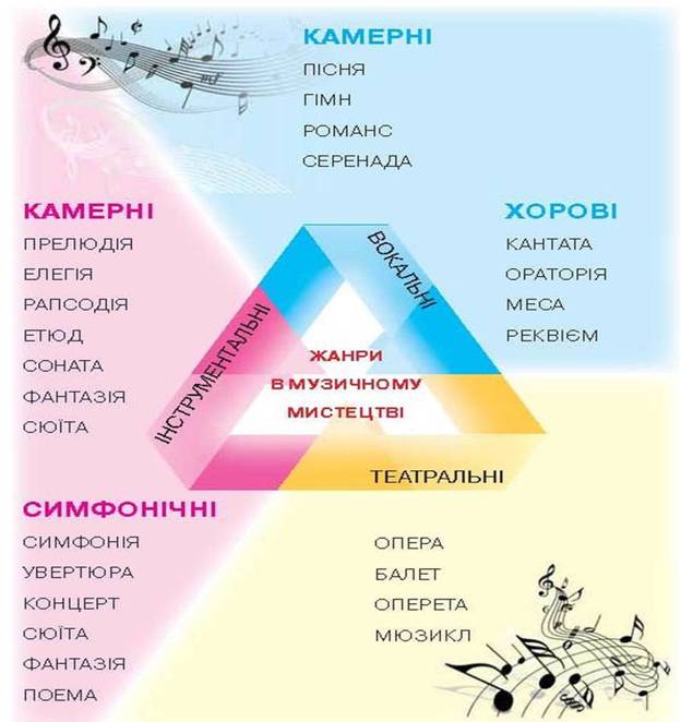 Існують жанри народні і професійні, вокальні й інструментальні, камерні і симфонічні і т. д. В ширшому аспекті категоризації виділяють оперний жанр, симфонічний жанр, камерний жанр і т. д.; при вужчих аспектах утворюють менші групи: велика опера, комічна опера, лірична опера, музична драма і т.